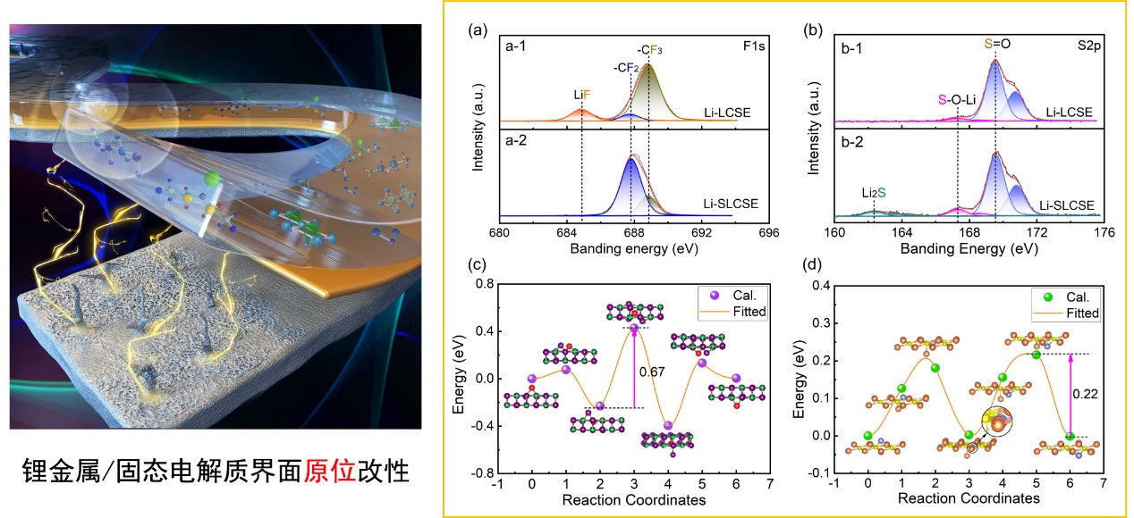 针对上述问题,必赢76net线路唐伟教授团队与新加坡国立大学化学与生物工程系郑光远助理教授、北京航空航天大学缪奶华副教授合作,联合报道了一种3Li2P⸱2P2S5-LiTFSI-PVDF复合固态电解质(SLCSE)。该复合固态电解质在电池充放电过程中,能够在锂金属负极表面原位生成一种含Li2S修饰的界面层。实验结果显示该界面层能够减缓复合固态电解质中PVDF的分解。结合理论计算发现该界面层还可以同时提升复合固态电解质与电极之间的界面接触性能,并降低锂离子通过界面层的势垒,有效改善了锂在负极的沉积均匀性,从而抑制锂枝晶的生长。