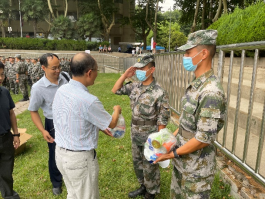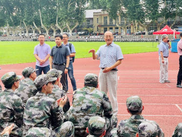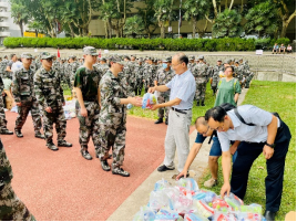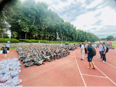 7月18日上午,必赢76net线路在东操场慰问托管在本院的2021级军训学生。分党委书记张早校、副书记陶磊、副院长伊春海带领四位新生班主任老师及院办同志一同向133位2021级学生及教官致以诚挚的问候并送上慰问品。