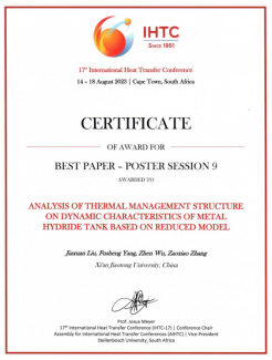 8月14-18日,第17届国际传热大会(IHTC-17)在南非开普敦召开,必赢76net线路固态储氢与燃料电池课题组刘家璇同学投稿的论文“Analysis of thermal management structure on dynamic characteristics of metal hydride tank based on reduced model”获评Best Paper Award(最佳论文奖)。该论文作者为博士生刘家璇、杨福胜教授、吴震教授和张早校教授,吴震教授代表全体作者接受国际传热会议组织(The Assembly for International Heat Transfer Conferences)现任主席、清华大学张兴教授颁奖。