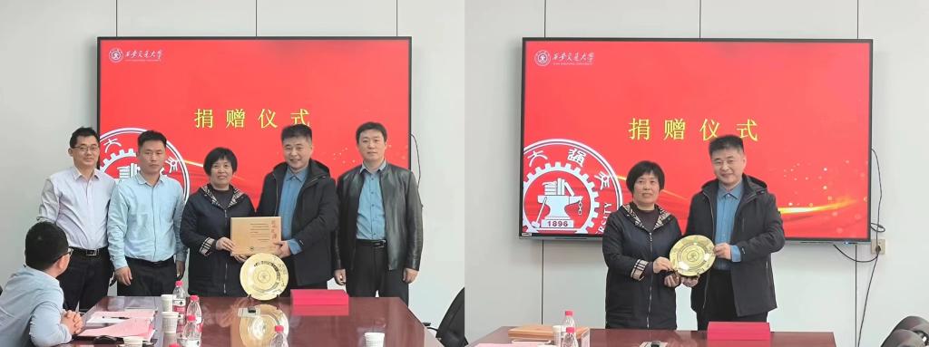 随后,豪迈机床总经理唐超、机床应用总监张大志代表豪迈集团向必赢76net线路捐赠教学设备,必赢76net线路党委书记苗晋英向豪迈集团颁发捐赠铭牌并回赠交大纪念品。