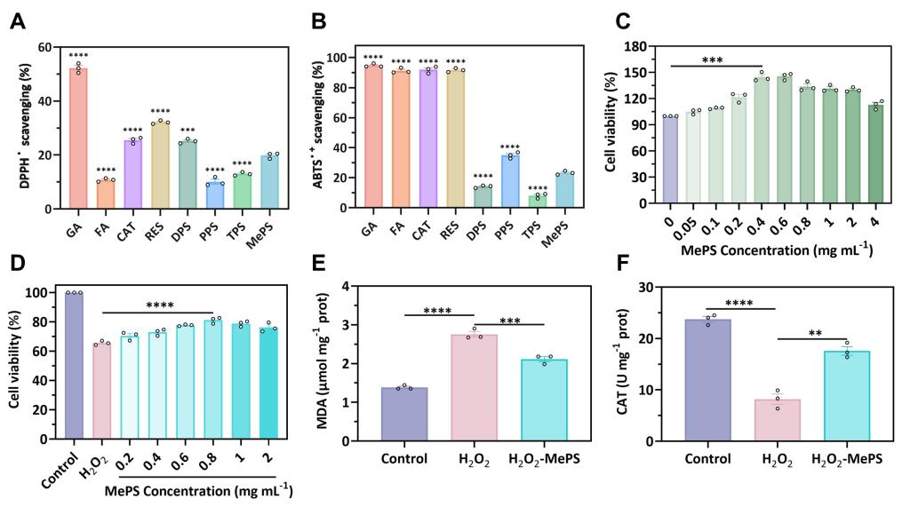 为深入研究甲烷基多糖的生物活性方面,研究团队开展了化学测试和细胞验证实验。结果显示,甲烷基多糖的自由基清除能力显著高于阿魏酸以及石斛、茯苓、银耳等天然植物源多糖。巨噬细胞培养实验进一步证明,添加甲烷多糖不仅能促进正常细胞的增殖,还可以通过降低脂质过氧化物含量和修复抗氧化酶活性,将氧化损伤胁迫下细胞的存活率提高近20%(图2)。这一结果有力地证明了甲烷基多糖具高抗氧化活性,为其在生物医用材料领域应用奠定基础。相关研究成果已发表于国际知名期刊《Journal of Agricultural and Food Chemistry》,西安交通大学为第一通讯单位,费强教授、傅容湛教授、范代娣教授为共同通讯作者。