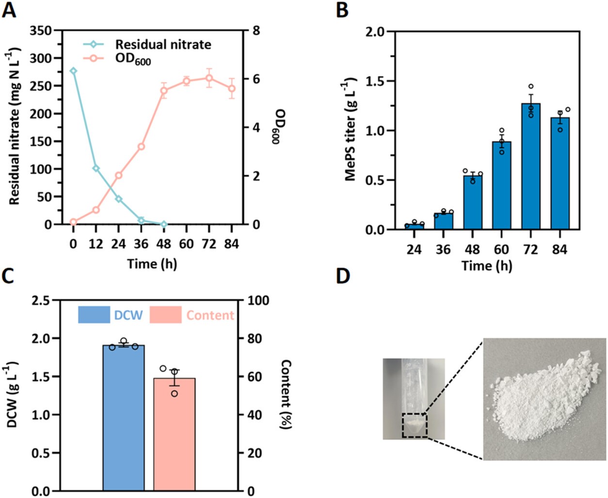 多糖是一类由醛糖或酮糖单体通过糖苷键连接而成的天然高分子化合物,具有广泛的应用前景和快速增长市场规模,尤其是在化妆品和医用领域。然而,传统的植物提取方法效率较低且成本较高,而动物源多糖则存在病原体污染和免疫原性等安全风险。因此,开发微生物替代制备技术已成为行业发展的迫切需求。费强教授团队联合西北大学范代娣教授团队,通过太空育种、适应性进化等非理性诱变手段,成功选育出高产细胞多糖的嗜甲烷菌株。经过进一步优化培养条件和发酵工艺,该菌株多糖含量可提升至50%以上,为现有最高报道值(图1)。理化测试分析表明,甲烷基多糖是由葡萄糖单体通过均一聚合形成,其分子量达280 kDa。这种多糖具备优良的化学稳定性和机械加工性能。此外,其结构中含有多种糖苷键形成包含直链和支链的聚合物,可显著增强了其生物反应活性。