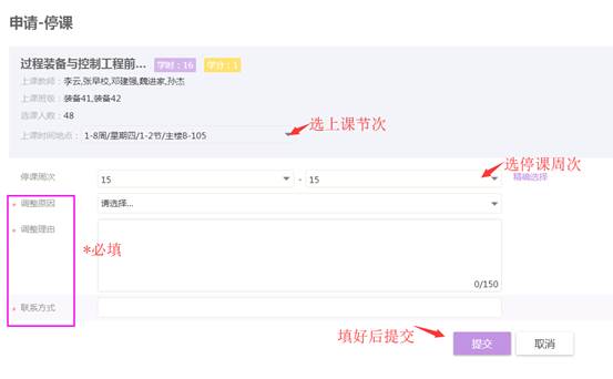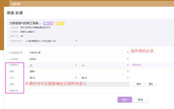 调课(确定补课时间)、停课(不确定补课时间)补课(之前办理过停课的)教师根据情况进行选择。