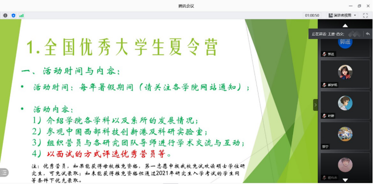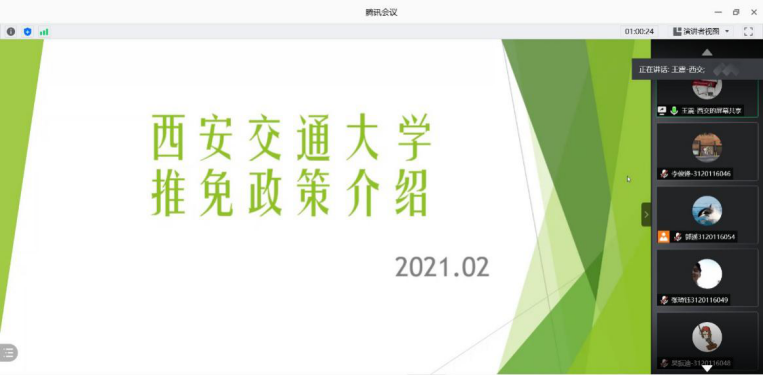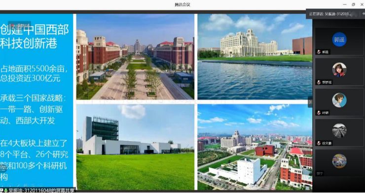 2021年2月25号下午3时,宣讲活动正式开始,首先是本科来自西安交通大学的吴振迪同学对西安交通大学的历史和发展情况做了介绍。之后吴振迪同学介绍了建校以来学校取得的科研成果和中国西部科技创新港的建设情况与内涵理念。吴振迪同学讲中国西部科技创新港是陕西省和西安交通大学落实“一带一路”、创新驱动及西部大开发三大国家战略的重要平台,是依托西安交通大学教育科研优势,建设创新型省份、助推经济社会持续健康发展的重大战略性项目。创新港定位为国家使命担当、全球科教高地、服务陕西引擎、创新驱动平台、智慧学镇示范。听完吴振迪同学的讲述,同学们不仅对西安交通大学有了更加全面的认识,更对中国西部科技创新港心旷神怡,视频和ppt中展示的创新港优美的环境,独立的宿舍空间,完善的服务设施和科技化的大学校园给众多学子留下了深刻的印象,更有学生提问“视频中的宿舍条件是真的吗?”“学校竟然可以刷脸进门?”