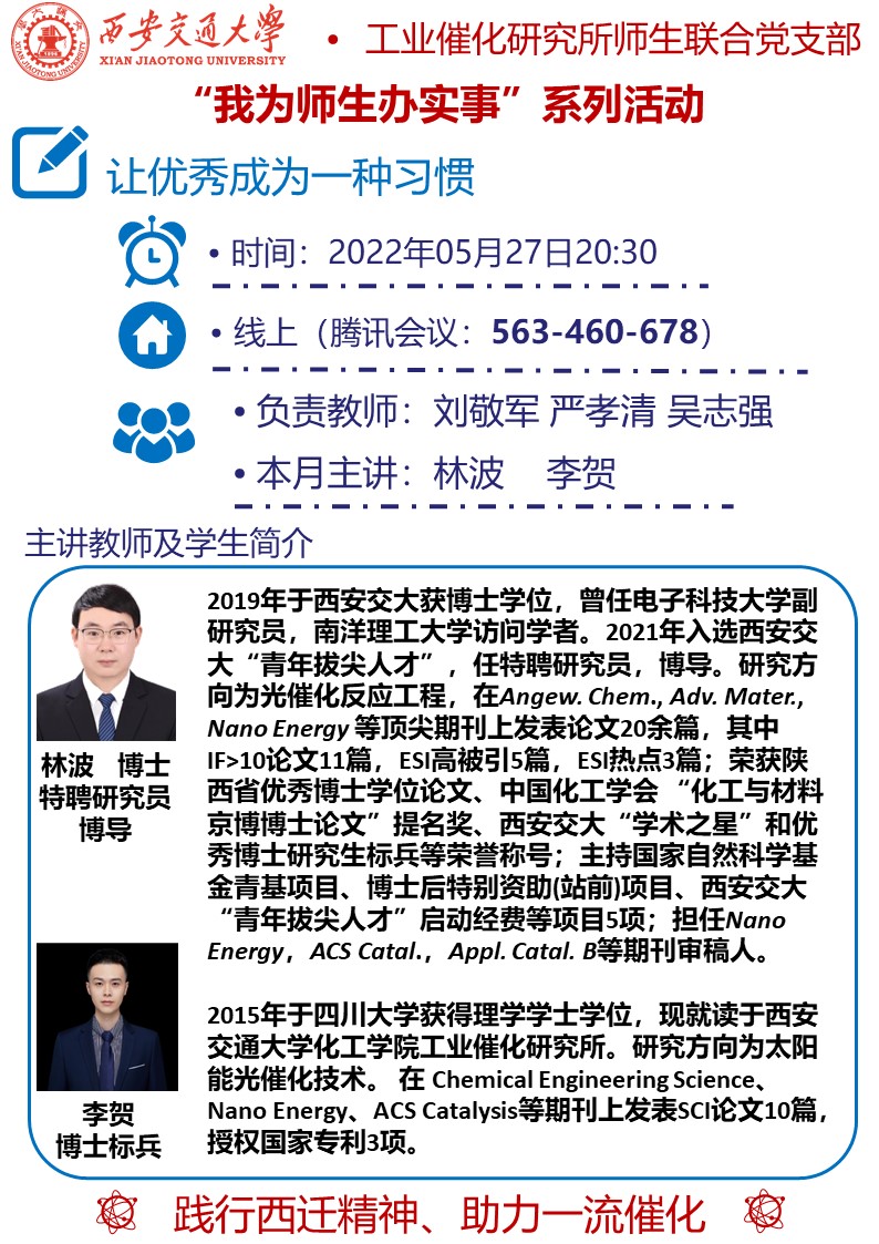 2022年5月工业催化所师生联合党支部在创新港举办了“我为师生办实事”系列活动之“让优秀成为一种习惯”科研经验分享会。本次经验分享会邀请了必赢76net线路特聘研究员林波老师和必赢76net线路李贺博士作为主讲嘉宾。本次活动由支部委员严孝清同志主持,二十余名研究生参加了本次活动。二位主讲人从各自的科研历程出发,为研究生带来了精彩的演讲,并在互动环节解答了同学们在科研上的疑问。