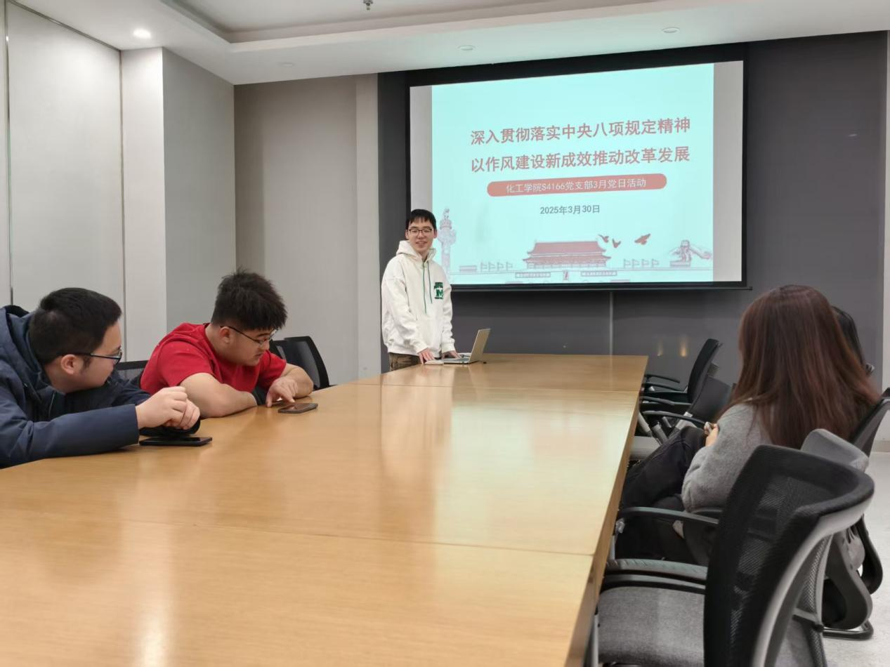 2025年3月30日,硕4166党支部在创新港19号楼4183会议室召开以“学八项规定精神,强作风促发展”为主题的组织生活会。活动由党支部书记梁徽萧主持,全体党员参会。