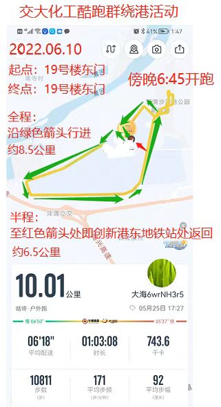 跑步路线全程约10公里,由泓润楼东门出发,绕创新港外围一周,老师们自由选择半程(6.5公里)或全程(10公里)。
