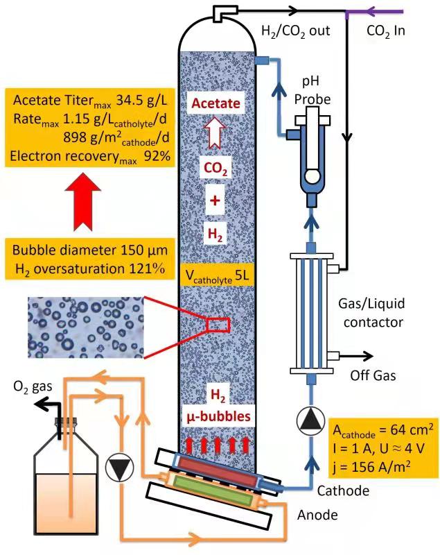 为了提高氢气在反应器内保留时间,受到鼓泡塔反应器的启发,必赢76net线路郭坤特聘研究员课题组构建了一种电解氢气鼓泡塔反应器(图1)。该装置将电解槽置于反应器的底部用于原位提供氢微气泡,鼓泡塔置于电解槽上部以增加电解氢气泡在反应器的保留时间。在此反应器中接种同型产乙酸功能菌群,在156 A/m2电极电流密度条件下,鼓泡塔的存在可将反应器的库伦效率从5%提高到70%。该反应器的产乙酸速率达到898 g/m2阴极/d(1.2 g/L反应器/d),是绝大多数基于生物膜的MES反应器产乙酸速率的10倍以上。
