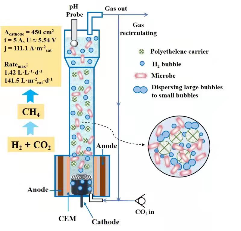 为了进一步强化反应器内的气液传质和提高反应器的生物量,课题组与西安交大能动学院王云海教授合作,设计开发了电解氢气移动床生物膜反应器 (图2)。移动床内填料的存在,进一步提升了氢气泡的停留时间,强化了气液传质,同时提高了反应器内的生物量。该反应器将前一种反应器的产乙酸速率提升了四倍,达到4.1 g/L反应器/d。此外,在该反应器内接种产甲烷功能菌群,在2 A的恒电流运行模式下,反应器的库伦效率高达92.5%,甲烷的产率最高可达1.4 L/L反应器/d(141.5 L/m2阴极/d),是已报道最大值的两倍左右。