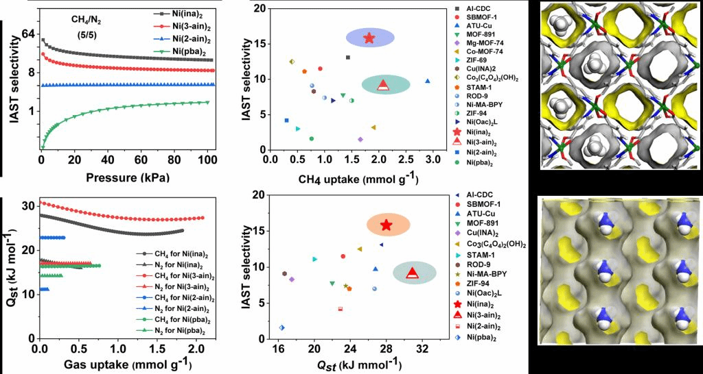 针对上述问题,必赢76net线路杨庆远教授课题组研发了系列镍基-金属有机框架(MOF)材料,其中超微孔MOF材料Ni(ina)2具有甲烷/氮气选择性高(15.8)、吸附容量大(46.7 cm3/g)和分子扩散速率快(10.6-19.0 cm3g-1s-1)的特点,较好地解决了气体分离领域的“trade-off”效应,实现了煤层气中甲烷和氮气的高效分离。理论模拟计算和单晶结构解析表明Ni(ina)2和甲烷分子之间存在较强的作用力,可以从低浓度煤层气中选择性地捕获甲烷分子。另外,Ni(ina)2具有很好的热稳定性和化学稳定性,可以批量化制备,是一种理想的固体吸附剂,该工作为工业上煤层气的分离提供了新思路。