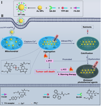 针对上述问题,必赢76net线路陈鑫教授团队与西安交通大学药学院张彦民教授团队构建了一种唾液酸(SA)、叶酸(FA)和三苯基膦(TPP)共修饰的金纳米颗粒(SFT-Au),其利用线粒体中丰富的钙,以及SFT-Au的钙螯合和钙依赖光热特性,实现肿瘤线粒体的精确快速钙化,有效治疗恶性肿瘤。在治疗过程中,SFT-Au首先通过FA和TPP的逐步靶向过程在肿瘤线粒体中积累。之后,SA片段进一步与肿瘤线粒体中过表达的Ca2+结合,诱导SFT-Au聚集。SFT-Au不仅聚集Ca2+启动线粒体钙化,而且在808 nm照射下原位生成光热剂进行光热转化,促进线粒体钙化。从而有效抑制肿瘤细胞的能量代谢,进行饥饿治疗,并对肿瘤细胞进行持续的光热损伤,提高治疗效率(图1)。体外和体内实验结果表明,Ca2+依赖性光热疗法和光热转化促进线粒体钙化,显著抑制肿瘤生长,同时避免了意想不到的副作用。