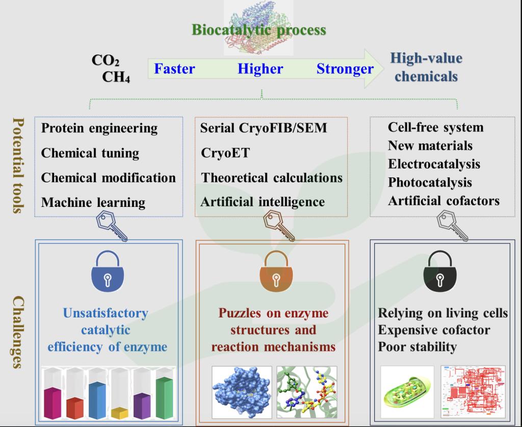 二氧化碳(CO2)和甲烷(CH4)是导致全球气候变暖的主要温室气体。作为碳排放量最高的国家,我国面临巨大的减排压力。若以CO2和CH4为原料合成高值化学品,既可以减少其排放,又可以解决原料短缺的问题,是非常具有吸引力的温室气体减排策略。生物转化能够在温和条件下将CO2和CH4转化为高附加值的复杂化学品,具有选择性高、能耗低、环境友好等优势,是具有显著绿色制造特征的温室气体高值化途径。直接催化CO2和CH4转化的酶是决定温室气体转化效率和目标产物产量的关键,在温室气体的生物转化过程中扮演着重要角色。